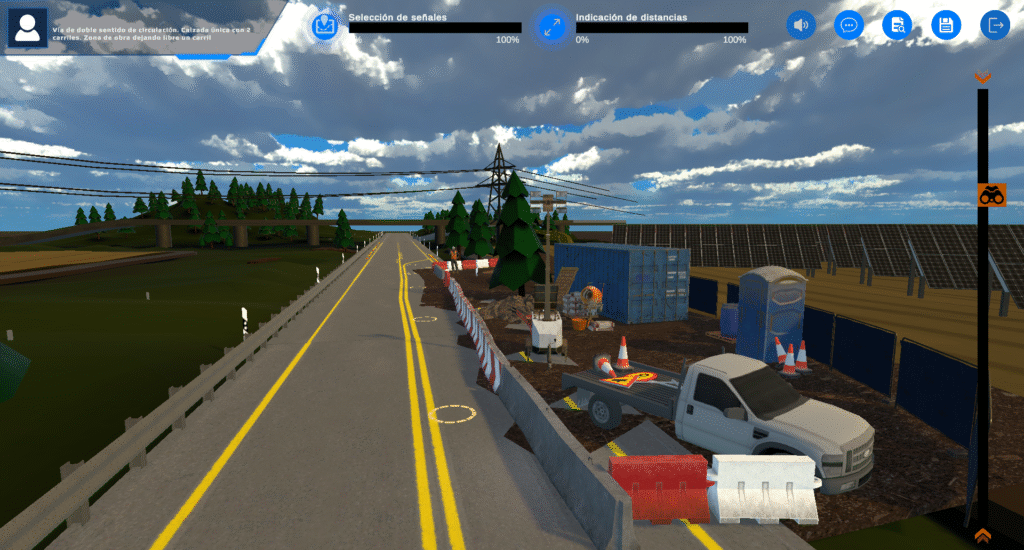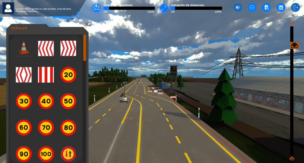 En cada escenario propuesto en el módulo práctico de 83IC-APP, el alumno deberá colocar las señales y el balizamiento correspondiente y determinar la distancia entre dichos elementos, una vez finalizada la tarea, la aplicación realizará una evaluación automática de las decisiones adoptadas por el alumno.