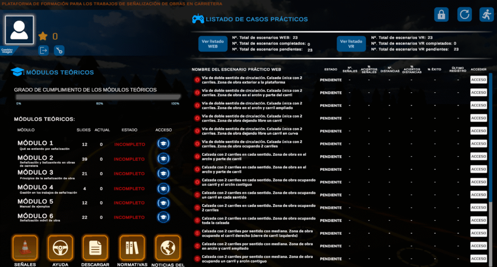 83IC-APP también dispone de un módulo práctico para que el alumno aplique los conocimientos adquiridos sobre escenarios virtuales (se han definido más de 20) que reflejan actuaciones en, o junto a, la calzada en tramos de carretera convencional y autovía. El alumno puede practicar desde un PC o mediante Gafas de Realidad Virtual, que introducen al alumno en un entorno inmersivo lo que facilita su aprendizaje.